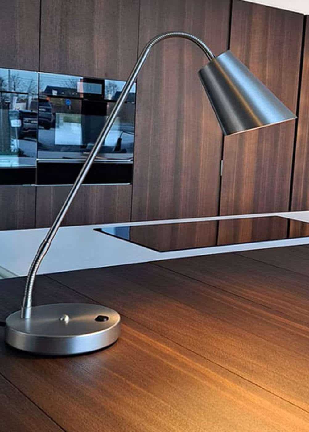 Mit ihrem gebürsteten Stahl- und Aluminium-Design fügt sich die Clario Lampe harmonisch in moderne, minimalistische oder klassische Wohn- und Arbeitsbereiche ein. Sie ist zugleich funktional und stilvoll.